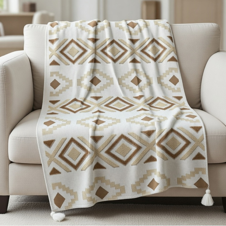شال مبل پانچ منگولهدار با طراحی خاص هندسی، انتخابی شیک و کاربردی برای جلوهدادن به دکوراسیون منزل شما ✨